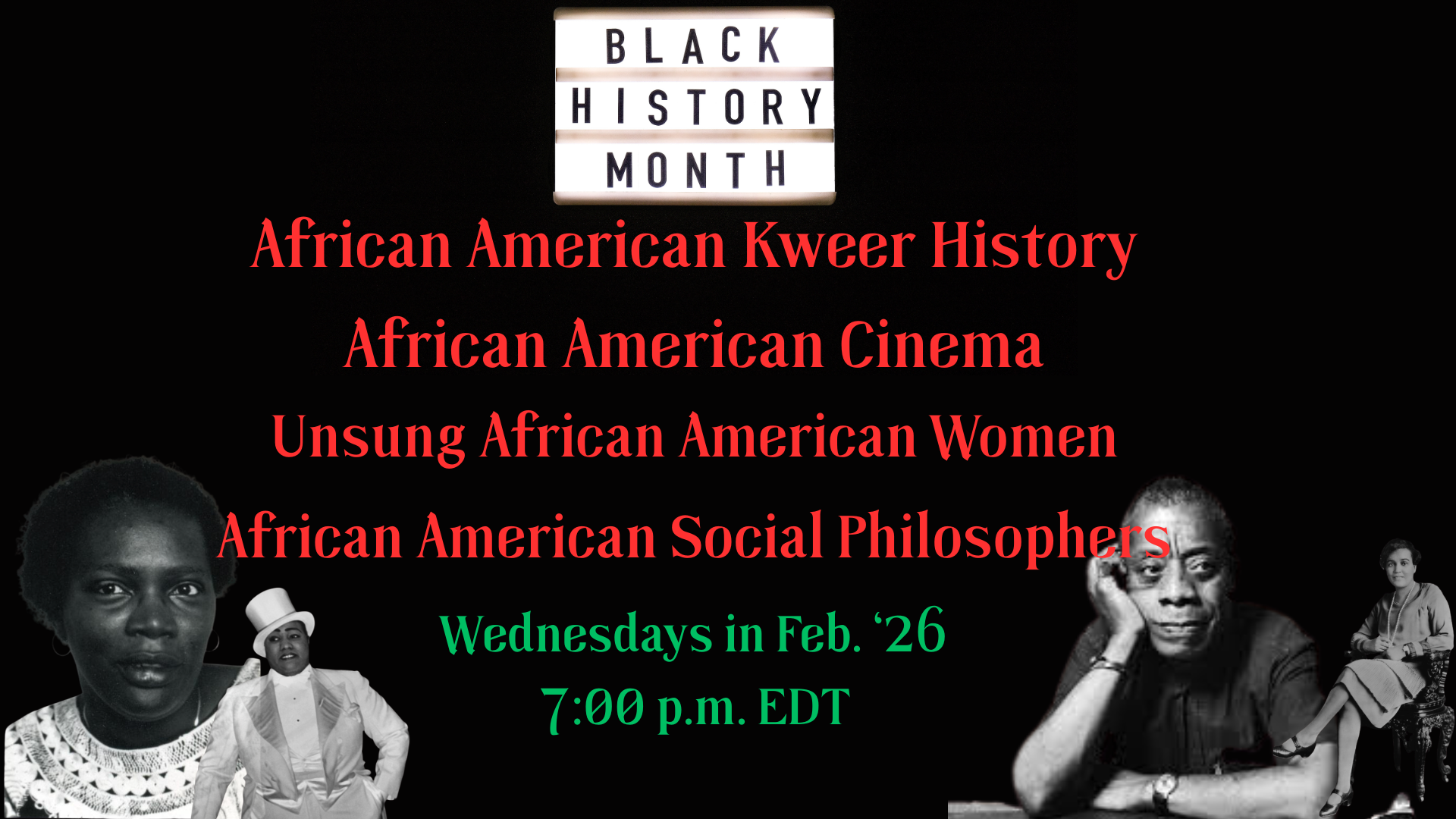 What We Offer BHM26 BHM26 BHM26: African American Kweer History This class explores the histories and contributions of African American LGBTQ+ people in the U.S.Join class on Feb 4, 2026 at 7pmLink is provided upon registration $25.00 BHM26: African American Cinema This class will explore the history of African Americans in Cinema from the early 20th Century until the present.Join the class on February 11, 2026 at 7pm EDTLink provided upon registration. $25.00 BHM26: Unsung African American Women This class explores the contributions of African American women who deserve more love and should become household names.Join the class on February 18, 2026 at 7pm EDTLink provided upon registration. $25.00 BHM26: African American Social Philosophers This class will explore the works and philosophies of some of the greatest African American thinkersJoin the class on February 25, 2026 at 7pm EDTLink provided upon registration. $25.00 BHM26: Entire Series Register for the ENTIRE series in one swoop! $85.00